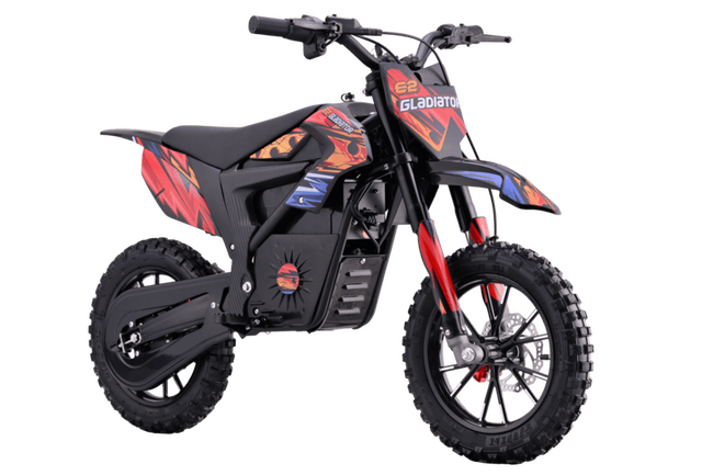 GLADIATOR E2 — компактный электрический питбайк, созданный для активных поездок по закрытым площадкам и легкому бездорожью. Модель оснащена электрическим двигателем мощностью 550 Вт и литий-ионным аккумулятором 36 В 7,8 А·ч, обеспечивающим запас хода до 15 км.